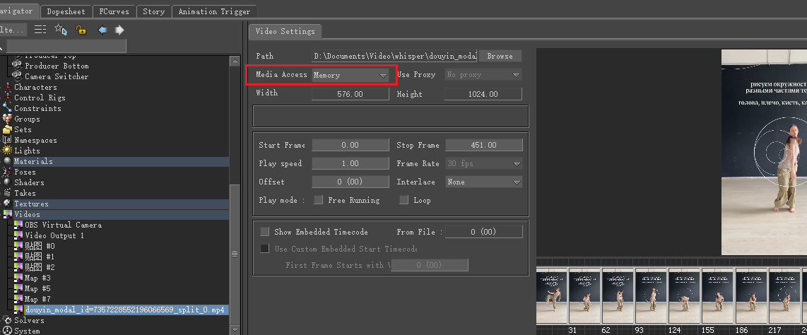 如上图,在 MotionBuilder 场景中有个面片模型显示参考的视频。
