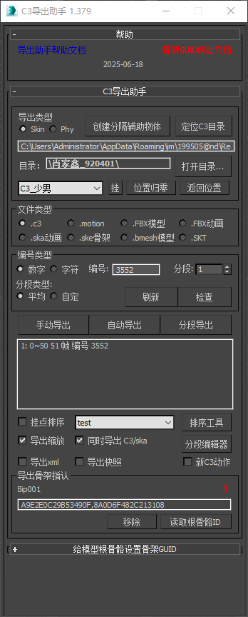 - 1.勾上【同时导出 C3/ ska 】会执行两次导出命令,分别是C3,Ska流程,而且支持导出蒙皮骨骼影响数上限 = 4 的C3动作文件。